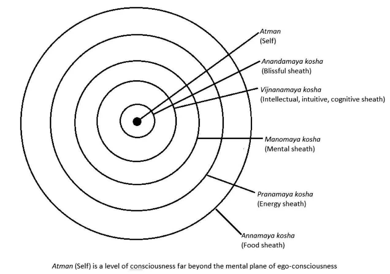 Atman (True Self): Atman is the true Self, the eternal part of us that never changes—it was never born and will never die. Imagine a light shining through different lampshades: the light is Atman, and the lampshades are the layers (koshas) we experience in life. Though the light shines through, it takes on the color of each layer.